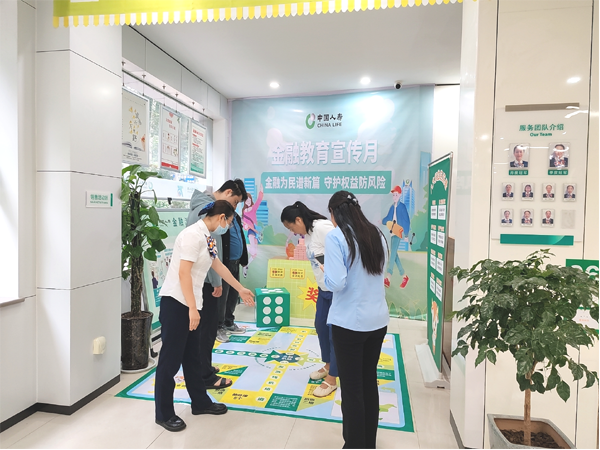 中國人壽壽險(xiǎn)漯河分公司黃河路營業(yè)廳內(nèi)設(shè)置了全國統(tǒng)一的“金融知識便利店”,分為活動主海報(bào)、禮品區(qū)、金融機(jī)場互動版塊、“八大權(quán)益”連連看互動板塊,將金融知識融入妙趣橫生的互動游戲之中。金融機(jī)場飛行棋游戲互動版塊分為保險(xiǎn)專機(jī)、反詐專機(jī)、反洗錢專機(jī)、反非專機(jī),客戶朋友們輪流擲骰子前進(jìn)或后退,根據(jù)點(diǎn)數(shù)對應(yīng)位置進(jìn)行做俯臥撐、背古詩、蹲起、模仿動物叫的游戲和學(xué)習(xí)金融保險(xiǎn)知識等。“八大權(quán)益”連連看活動讓客戶朋友們?nèi)娴亓私庀M(fèi)者八大權(quán)益等知識,大家在歡聲笑語中輕松掌握金融防騙、反洗錢、防范非法集資、金融保險(xiǎn)知識等。公司對參與互動游戲的客戶朋友們送上了中國人壽專屬的小禮品,讓客戶在參與中收獲知識與喜悅。同時,寓教于樂的游戲項(xiàng)目有效提升了金融知識普及的覆蓋面與接受度,彰顯了中國人壽服務(wù)社會的責(zé)任擔(dān)當(dāng)。