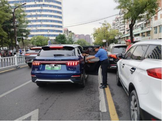 配合學(xué)校營(yíng)造暢通有序、健康文明的校園周邊環(huán)境。各網(wǎng)格城市管理人員幫助學(xué)生家長(zhǎng)提供開(kāi)車(chē)門(mén)、搬運(yùn)行李、護(hù)送學(xué)生過(guò)馬路等暖心服務(wù)。在做好護(hù)航入校的同時(shí),并做好中午、晚間