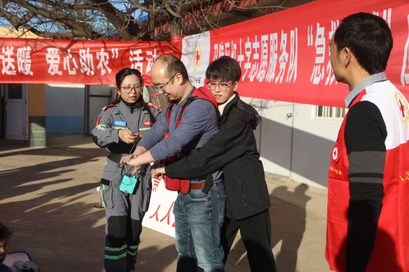首先進(jìn)行“急救地?cái)?rdquo;應(yīng)急救護(hù)演練,區(qū)紅十字志愿者們攜帶急救設(shè)備,現(xiàn)場(chǎng)演示急救技能,通過“大手拉小手”的方式,家長(zhǎng)和孩子們一起練習(xí)急救自救互救技能。