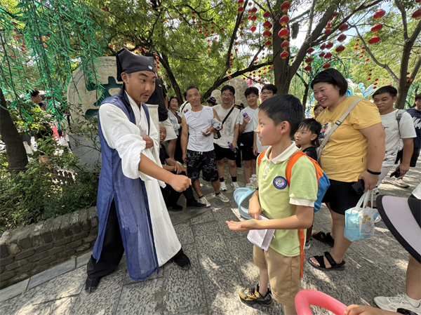 一踏入萬歲山武俠城,古色古香的宋代街巷和建筑便映入孩子們眼簾,仿佛穿越回了千年前的大宋。街道上,鄭記肉鋪、獅子樓、王婆茶莊等實(shí)景店鋪,充滿生活氣息,孩子們好奇地打量著,想象著古人的生活場景。街邊藝人的精彩表演引得孩子們陣陣驚嘆,歡呼聲此起彼伏?!度蜃<仪f》里,逼真的城墻、城門、大炮和烽火臺(tái),激烈的戰(zhàn)斗場面配合影視爆破、云梯炮戰(zhàn)、大型馬術(shù)等實(shí)景拍攝技術(shù),將《水滸傳》中的情節(jié)鮮活呈現(xiàn),孩子們看得目不轉(zhuǎn)睛,被綠林好漢們的江湖豪情深深吸引,演出結(jié)束后,掌聲雷動(dòng)。在萬歲山武俠城內(nèi),孩子們還觀賞了多場精彩絕倫的演出。從《吊環(huán)》的驚險(xiǎn)特技到《大宋奇兵》的英勇無畏,再到《李逵斷案》和《林沖戰(zhàn)楊志》……此外,孩子們還進(jìn)行了一系列互動(dòng)體驗(yàn)活動(dòng)。通過石頭剪刀布、投壺等游戲來賺取銀票,換取自己喜歡的物品。每一場演出都讓孩子們陶醉其中,流連忘返。