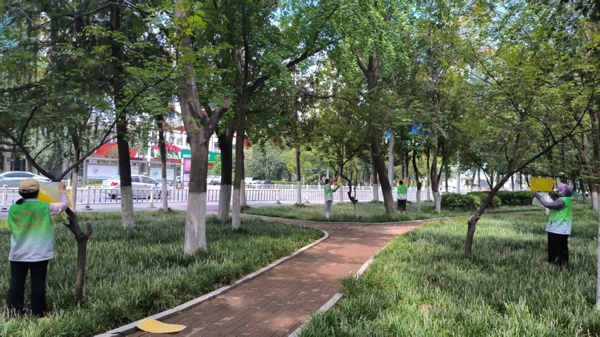 區(qū)園林職工懸掛粘蟲板防治白粉虱