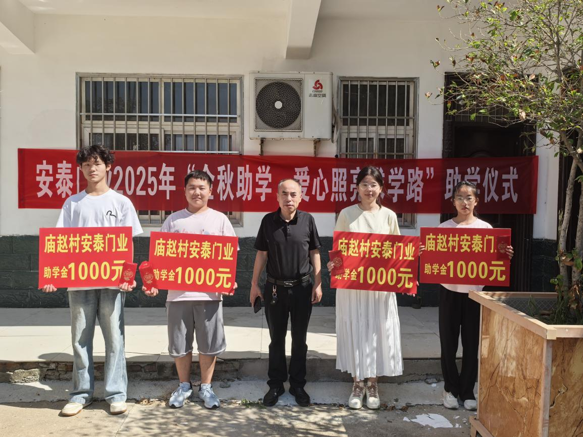 2025年8月22日上午,龍城鎮(zhèn)廟趙村洋溢著溫暖與希望的氛圍,愛(ài)心企業(yè)安泰門業(yè)2025年“金秋助學(xué)·愛(ài)心照亮求學(xué)路”助學(xué)儀式在這里隆重舉行,為村內(nèi)4名即將踏入大學(xué)校門的優(yōu)秀學(xué)子送去每人1000元助學(xué)金,以實(shí)際行動(dòng)履行企業(yè)社會(huì)責(zé)任,鼓勵(lì)村里的優(yōu)秀學(xué)子努力奮進(jìn),幫助他們更好地開(kāi)啟大學(xué)生活。