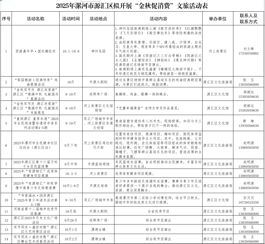 為深入貫徹落實(shí)國(guó)家、省、市關(guān)于促進(jìn)文旅消費(fèi)的決策部署,進(jìn)一步激發(fā)全區(qū)文旅市場(chǎng)活力、提振消費(fèi)信心、點(diǎn)燃群眾消費(fèi)熱情,拉動(dòng)文旅消費(fèi)增長(zhǎng),源匯區(qū)文旅局采取三項(xiàng)有力措施,精心籌備并扎實(shí)推進(jìn)金秋文旅消費(fèi)季活動(dòng)。