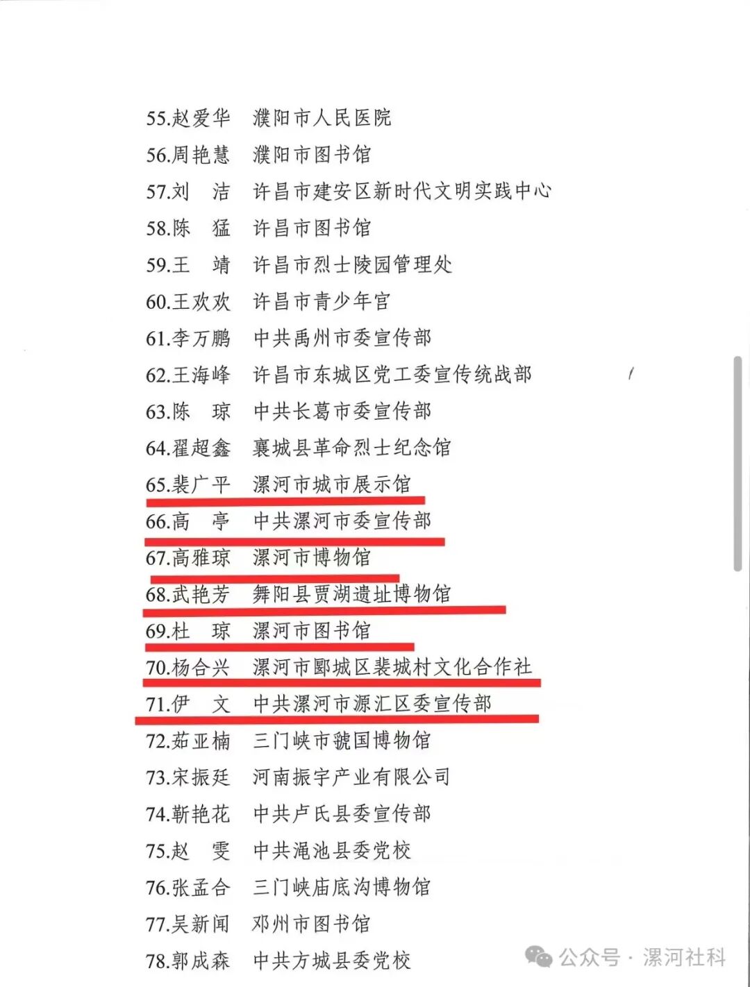 2024年社科普及志愿服務活動表現(xiàn)突出社科普及指導員(7名):裴廣平(漯河市城市展示館);高亭(中共漯河市委宣傳部);高雅瓊(漯河市博物館);武艷芳(舞陽縣賈湖遺址博物館);杜瓊(漯河市圖書館);楊合興(漯河市郾城區(qū)裴城村文化合作社);伊文(中共漯河市源匯區(qū)委宣傳部)