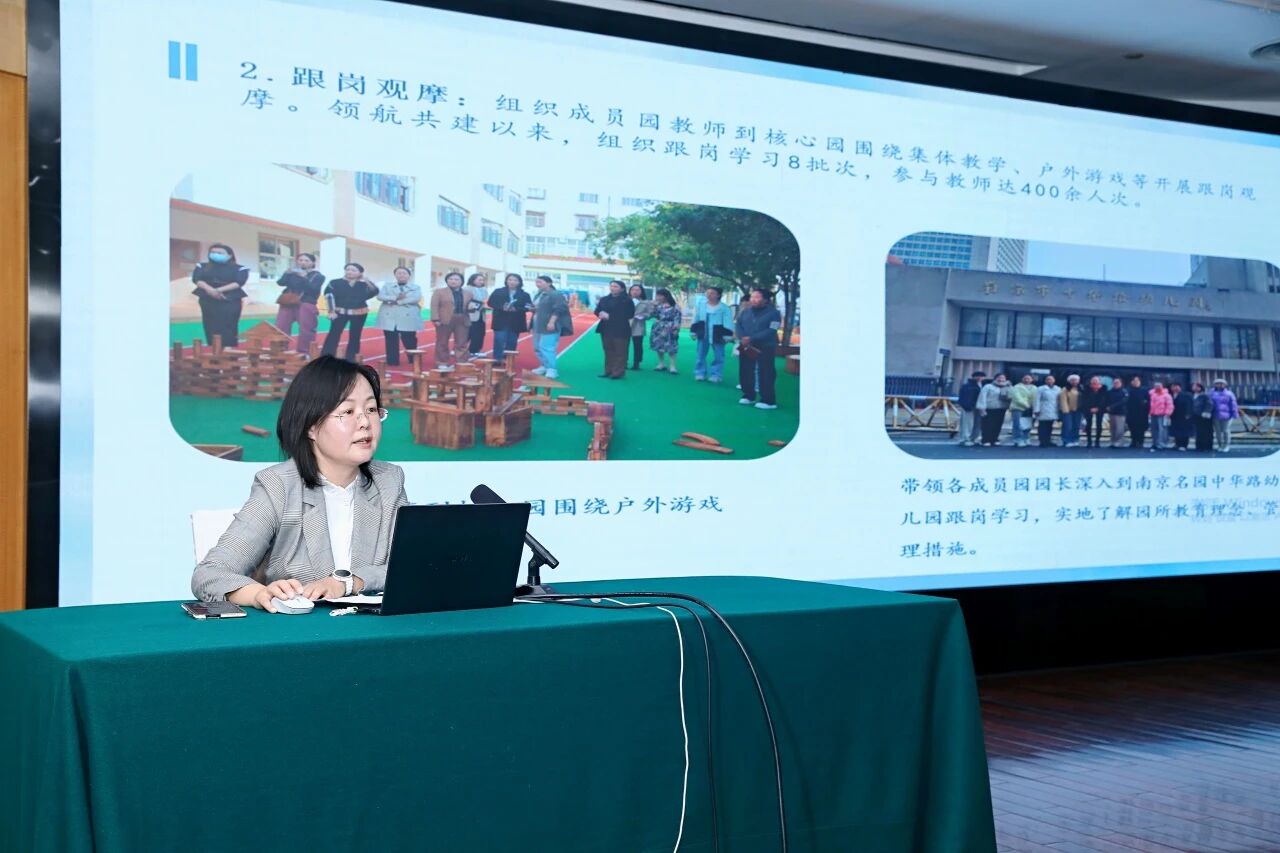 分享中,高林霞園長(zhǎng)從工作室概況、共建園基礎(chǔ)、領(lǐng)航內(nèi)容、措施、成果、特色以及領(lǐng)航工作展望七個(gè)方面展開介紹。針對(duì)成員園普遍存在的管理不規(guī)范、課程淺表化、師資薄弱等問題,該園精準(zhǔn)施策,建立“診斷-指導(dǎo)-提升”循環(huán)機(jī)制,制定“一年規(guī)范管理、兩年特色發(fā)展、三年質(zhì)量提升”的領(lǐng)航發(fā)展目標(biāo),運(yùn)用“3+3”領(lǐng)航工作模式,在園務(wù)管理、保育教育、師資隊(duì)伍三個(gè)方面開展領(lǐng)航共建。推廣市直幼兒園生活化教育課程理念,協(xié)同成員園開發(fā)園本化課程。每學(xué)期對(duì)每個(gè)園所進(jìn)行課程實(shí)施視導(dǎo)活動(dòng),確保課程建設(shè)落到實(shí)處。在師資建設(shè)上,通過師德培訓(xùn)、跟崗學(xué)習(xí)、師徒結(jié)對(duì)等方式,覆蓋面達(dá)到95%,助力40%以上的年輕教師快速成長(zhǎng)。