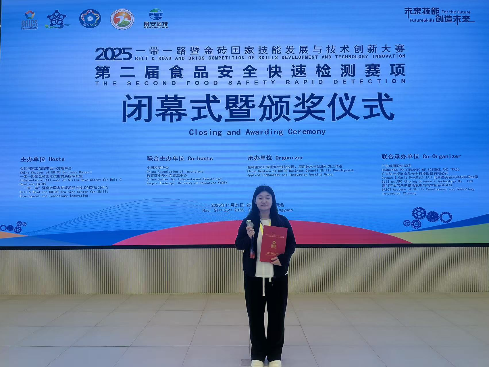 近日,2025“一帶一路”暨金磚國家技能發(fā)展與技術(shù)創(chuàng)新大賽“食品安全快速檢測賽項”全國總決賽在廣東科貿(mào)職業(yè)學(xué)院落下帷幕。漯河醫(yī)學(xué)高等專科學(xué)校(以下簡稱“漯河醫(yī)專”)公共衛(wèi)生與健康營養(yǎng)學(xué)院教師陳沖憑借扎實的專業(yè)知識和精湛的實踐操作能力,在教師賽中脫穎而出,榮獲二等獎,充分展現(xiàn)了學(xué)校在食品安全快速檢測領(lǐng)域的教學(xué)實力與人才培養(yǎng)質(zhì)量。