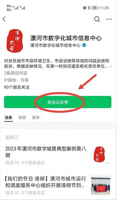 在微信搜索欄中搜索“漯河市數(shù)字化城市信息中心”或通過掃描二維碼關(guān)注公眾號。關(guān)注微信公眾號后,首先打開手機GPS定位功能。