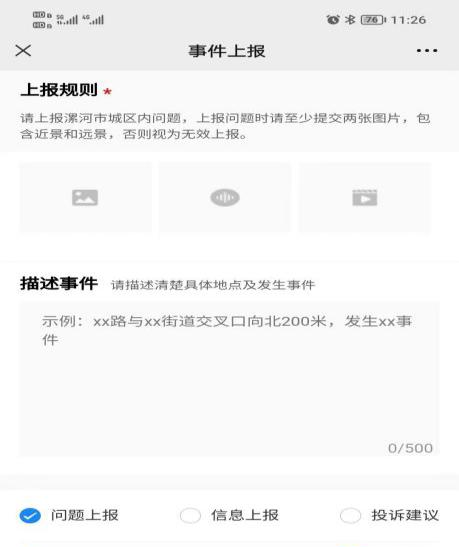 在公眾號主頁左下方點擊“問題上報”專欄,然后選擇“隨手拍”欄,按照規(guī)則提示進(jìn)行操作。