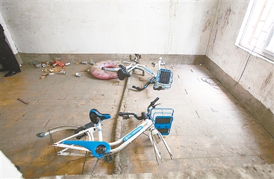 12月21日中午,記者來到市區(qū)漢江路與太行山路交叉口東北角的一處城中村,見三輛共享單車所在的民房垃圾遍地,一床破舊的鋪蓋堆放在一個房間里。被拆解的兩輛共享單車,在二樓的一個房間內(nèi),車輪不見了,車鎖也被破壞。