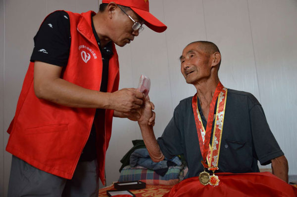 漯河市“愛(ài)心爸媽”公益團(tuán)一行20人,驅(qū)車120余公里,帶著全團(tuán)三百五十八位成員的濃濃愛(ài)心,帶著對(duì)老英雄們深深的敬仰,帶著慰問(wèn)品和慰問(wèn)金,先后慰問(wèn)了陽(yáng)縣舞泉鎮(zhèn)的張保安(90歲)、馬志祥(87歲),九街鎮(zhèn)藏灣村的藏彥邦(88歲)和牛趙村的趙中范(89歲)等四位抗美援朝老英雄。同時(shí),看望了兩代軍人之家藏軍輝家庭。