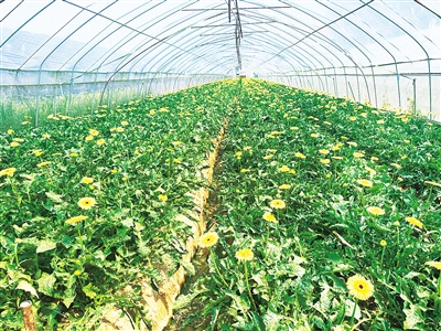 記者在菊花種植基地的大棚里看到,扶蘭、王子、菜花黃、黃白菊幾個品種的菊花競相綻放,有幾位村民正在忙著除草。