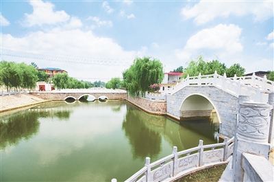 同時,對村內(nèi)300多畝荒坑、荒塘進(jìn)行了綜合整治,通過開挖疏浚、石砌邊坡形成了完整的環(huán)村生態(tài)水系,又在水系上建設(shè)形態(tài)各異的橋梁9座,安裝青石欄桿3000多米,鋪設(shè)環(huán)水系步道6000多米,對兩岸進(jìn)行高標(biāo)準(zhǔn)綠化、亮化,投放觀賞魚100萬尾。