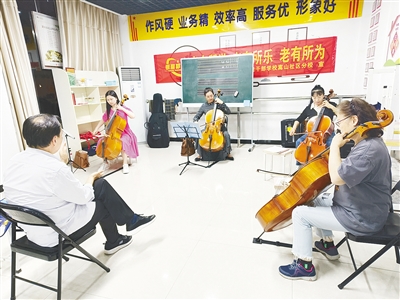 在嵩山社區(qū)多功能室,大提琴班的學員在練習大提琴。