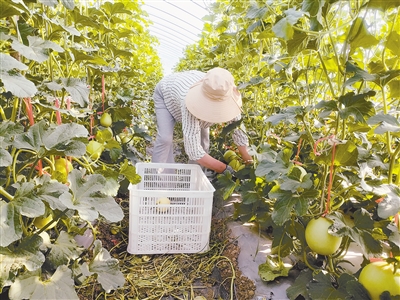 在甜瓜大棚,翠綠的甜瓜秧爬滿了架子,甜瓜個(gè)大體重、色澤誘人。“‘綠寶’甜瓜一上市就供不應(yīng)求。這幾天我們?cè)黾恿巳耸郑涌觳烧?、裝車,爭(zhēng)取讓市民早一點(diǎn)兒嘗‘鮮’。”工人薛鳳蘭看著眼前掛滿棚架的“綠寶”甜瓜高興地說(shuō),“綠寶”甜瓜與普通甜瓜相比,糖度高、肉質(zhì)細(xì)脆多汁、口感清甜爽口,且含有大量的維生素等。大棚內(nèi)除了種植有“綠寶”甜瓜外,還有“星甜22”甜瓜、美都西瓜、櫻桃番茄等。