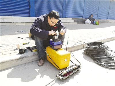 “可能是有大車經(jīng)過掛住線纜,導致線纜被拉長,最終垂落地上。”陳師傅邊熔纖,邊告訴記者。