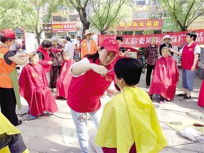 5月13日上午8點(diǎn)半,在市區(qū)煙廠花園廣場(chǎng),閆海燕半蹲著身體,拱著腰,一手拿著剪刀,一手拿著梳子,認(rèn)真地為一位老人理發(fā)。“我以前在家經(jīng)常幫奶奶剪頭發(fā),現(xiàn)在經(jīng)過一年多的鍛煉,手藝更加?jì)故炝恕?rdquo;閆海燕笑著說。
