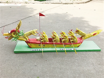 “先用鐵絲編織出模型,然后再把彩帶依著鐵絲的模型纏在外面,彩帶要錯(cuò)落有致,能體現(xiàn)出龍頭及金豬身上的紋路,光龍頭就編了四個(gè)多小時(shí)。”王云峰說,龍舟雖然看著簡(jiǎn)單,可制作起來并不容易。為了能盡快完工,他每天晚上都忙到12點(diǎn)多。