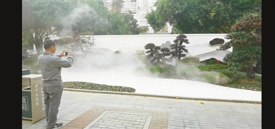 走近美景,記者看到了錯落有致的假山、精心布局的綠植、小石子鋪成的石徑,以及不斷噴發(fā)出的水霧,真是一道美麗的風景。