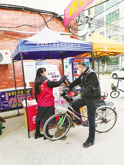 近日,郾城區(qū)沙北街道泰山社區(qū)發(fā)布防疫志愿者招募令,短時(shí)間內(nèi),有45名志愿者積極報(bào)名。據(jù)社區(qū)負(fù)責(zé)人趙保偉介紹,泰山社區(qū)共有28個(gè)無主管小區(qū),2個(gè)專業(yè)小區(qū),常住居民1.43萬人,共設(shè)立7個(gè)卡點(diǎn)。圖為志愿者為社區(qū)居民測(cè)量體溫。記者 吳艷敏 攝