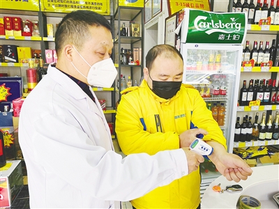 王黎明所在的社區(qū)有5平方公里,居民將近1萬人,最近復工復業(yè)的店鋪有百十家, 他每天都要把這些店鋪走個遍,就像醫(yī)院里的醫(yī)生“查房”一樣,給店鋪的員工測量體溫,了解他們的身體健康狀況,然后做好登記。同時,他還要指導店鋪開展好環(huán)境消毒,給員工們講解防疫知識以及如何正確佩戴口罩。
