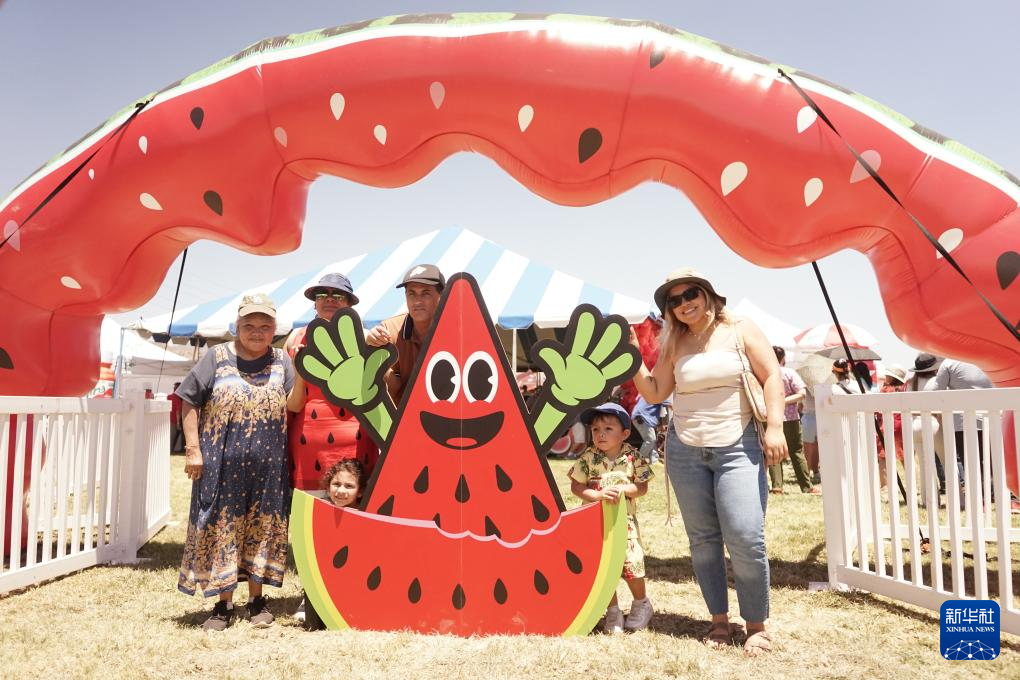 6月22日,人們?cè)诿绹永D醽喼萋迳即壟e行的加州西瓜節(jié)上留影。
