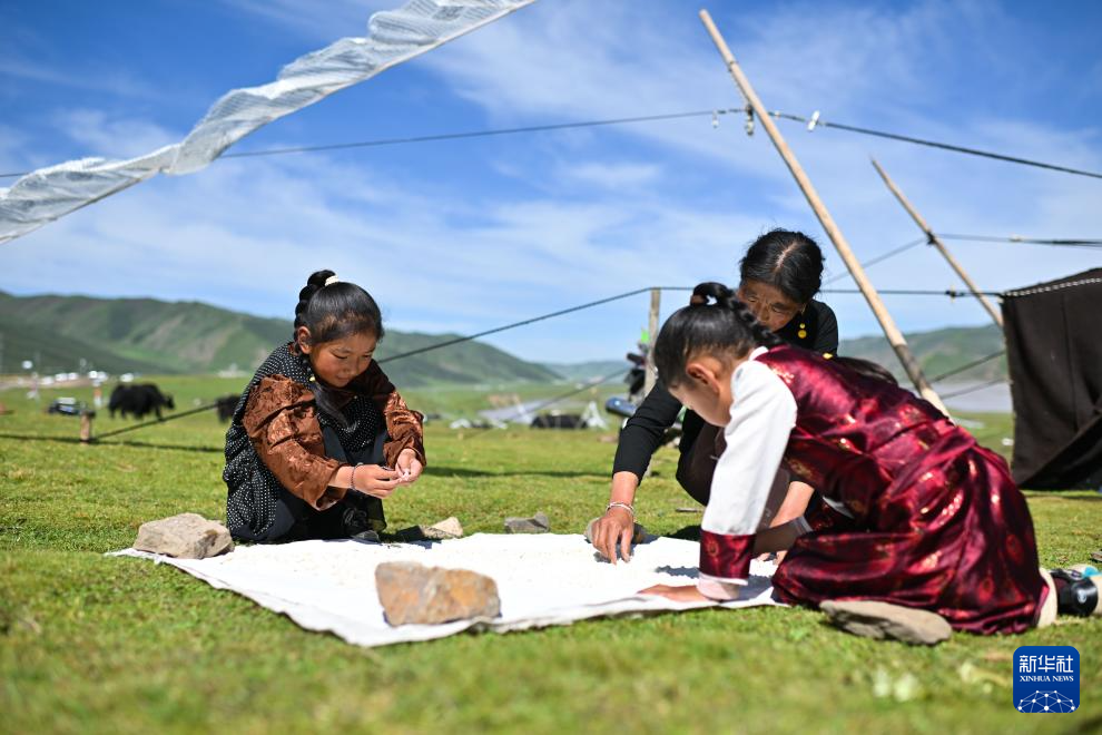 8月1日,尕瑪拉毛(左)在幫媽媽曬曲拉(一種奶制品)。
