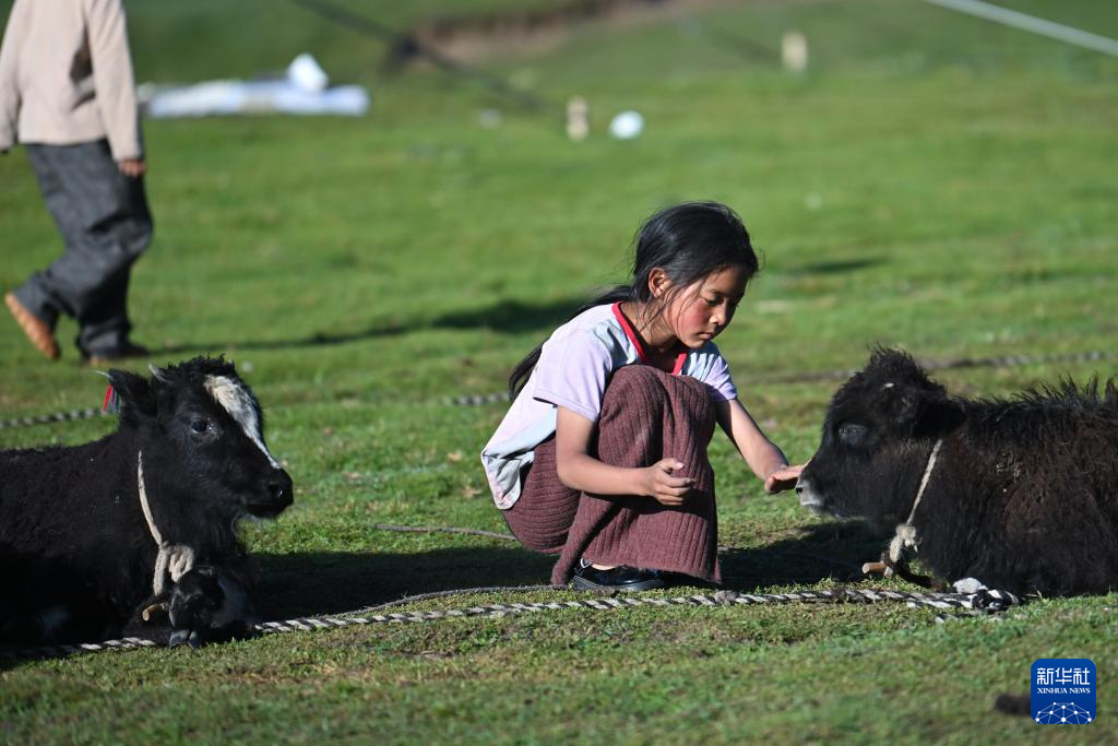 7月31日,多杰措在草原上撫摸一只牦牛牛犢。