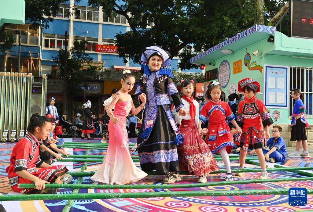 3月27日,老師和孩子們在廣西南寧市民族大道東段小學跳竹竿舞。